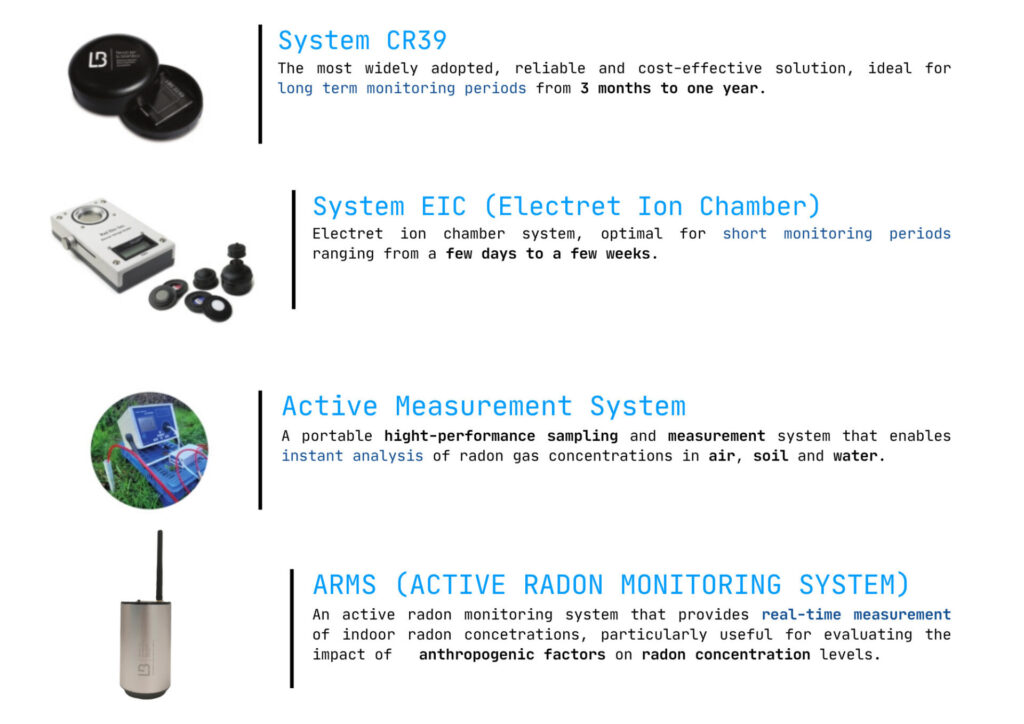 LB Servizi offers three ACCREDIA-accredited technological solutions to determine the average radon gas activity concentration in air, using state-of-the-art instruments that ensure precise, reliable measurements with metrological traceability.